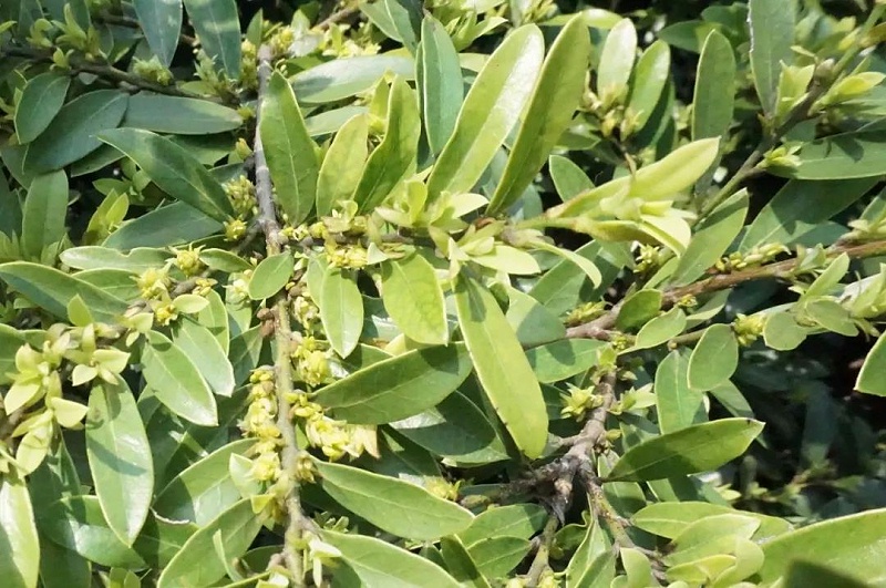小叶蚊母‘娇黄’(品种权号: 20190185)与‘紫胭’(品种权号: 20190184),金缕梅科、蚊母树属,常绿小灌木。 ‘娇黄’,嫩叶淡黄色,新梢淡黄色,穗状花序黄色; ‘紫胭’,嫩叶蓝紫色,穗状花序紫红色,极具观赏价值。